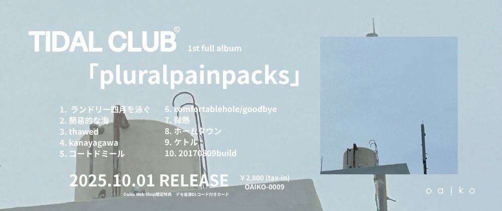 2020年8月、仙台で結成された4ピースバンド・TIDAL CLUBの初のフルアルバム「pluralpainpacks」がOaikoよりリリース。 粗末な生活と倦怠、そして少しのオルタナを抱え、00年代邦オルタナをルーツに、エモ、ネット音楽、インディーロックなど各メンバーの背景を融合させた楽曲を鳴らす。 10月1日にリリースされる初のフルアルバム「pluralpainpacks」は、直訳すると“複数の苦痛のパック”。日々の中でふと訪れる、誰にでもある取り留めのない苦しさをもとに生まれた全10曲を収録。メロディと歌詞だけでも成立するシンプルさを軸に、現実で巻き起こる感情の変遷を余すことなく言葉にしている。 気分が沈む日、途方もない曇り空と雨に包まれて最悪な気持ちになるのに、なぜか安心してしまう——そんな感覚を知る人へ。普段は感情を表に出さずに生きている人の荷解きにも寄り添う、“痛い”ほど正直な感情の詰め合わせ。TIDAL CLUBが紡ぐ10の物語は、聴く人の中の静かな痛みにそっと触れる。 アーティスト:TIDAL CLUB タイトル:pluralpainpacks 発売日:2025年10月1日(水) 価格:¥2,800(税込) 品番:OAIKO-0009 Oaiko Shop 限定特典:デモ音源DLコード付きカード 【収録内容】 1.ランドリー四月を泳ぐ 2.簡易的な海 3.thawed 4.kanayagawa 5.コートドミール 6.comfortablehole/goodbye 7.微熱 8.ホームタウン 9.ケトル 10.20170809build ------------------------------------ OVERSEAS SHIPPING IS AVAILABLE International shipments may take 2-4 weeks. Artist: TIDAL CLUB Title: pluralpainpacks Release Date: Wednesday, October 1, 2025 Catalog No.: OAIKO-0009 Oaiko Shop Exclusive Bonus: Card with download code for demo tracks Formed in Sendai in August 2020, TIDAL CLUB is a four-piece band releasing their first full-length album pluralpainpacks from Oaiko. Carrying a sense of modest living, ennui, and a touch of the alternative, they craft songs rooted in 2000s Japanese alternative rock while blending the diverse backgrounds of its members—emo, internet music, and indie rock. Their debut full-length album pluralpainpacks, out on October 1, literally translates to “multiple packs of pain.” Containing ten tracks born from the vague, everyday struggles that anyone might encounter, the record is built on a simplicity that stands on melody and lyrics alone, while capturing the shifting emotions of real life without omission. For those who know the feeling of being weighed down—when endless gray skies and rain make you feel terrible, yet strangely bring comfort. For those who live without showing their emotions outwardly, this album unravels those hidden burdens—an honest collection of feelings so “painful” in their truth. Through these ten stories, TIDAL CLUB gently touches the quiet pain that resides within its listeners.