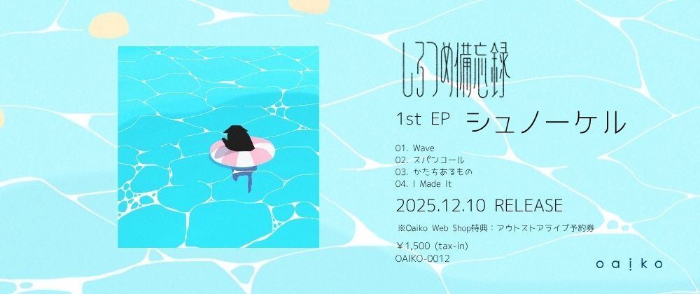 しろつめ備忘録による「海」をテーマにした1st EP「シュノーケル」をOaikoよりリリース。 荒々しい波を描く「Wave」、水面のきらめきを映す「スパンコール」、儚さと憧れを歌う「かたちあるもの」、そして新たな音世界を示す「I Made It」。 絶えず変化し循環する海のように、変わることを恐れず進む姿勢を映した、旧体制と新体制を結ぶ結び目のような作品。3人体制となった今のしろつめ備忘録の“現在地”を感じられる1枚。 アーティスト:しろつめ備忘録 タイトル:シュノーケル 価格:¥1,500(税込) 発売日:2025年12月10日(水) Label : Oaiko (OAIKO-0012) 【収録内容】 1.Wave 2.スパンコール 3.かたちあるもの 4.I Made It ------------------------------------ Oaiko Web Shop予約者限定 リリースアウトストアライブが決定。 しろつめ備忘録 1st EP「シュノーケル」release acoustic live 2026/1/17 Sat. 下北沢おてまえ OP 12:00 ST 12:30 ※Oaiko Web Shopにて1st EP「シュノーケル」を1/16までにご購入いただいた方限定のイベントとなります。 ※入場無料。入場時1D、600円いただきます。 ※先着制となります。予約注文後に10/20 19:00以降、本ライブ申し込みのURLをBASE.登録のメールアドレスにお送りいたします。 ------------------------------------ OVERSEAS SHIPPING IS AVAILABLE International shipments may take 2-4 weeks. Artist: shirotsumebiboroku Title: Schnorchel Release Date: Wednesday, Dec 10, 2025 Catalog No.: OAIKO-0012 Shirotumebibouroku releases their 1st EP “Snorkel,” themed around the sea, via Oaiko. ‘Wave’ depicts turbulent waves, “Spangle” reflects the shimmering water surface, “Things That Have Form” sings of transience and longing, and “I Made It” showcases a new sonic world. Like the ever-changing, cyclical sea, this work mirrors an attitude that advances without fear of change, acting as a knot connecting the old and new systems. It's a record that captures the “current location” of Shirotsumebibouroku as a trio.