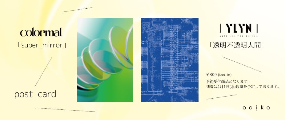 ※予約商品です。 ※到着は4月1日(水)以降となります。 colormalとyeti let you noticeのスプリットツアーを経て、それぞれの新曲をポストカード形式でリリース。 colormalからは「super_mirror」、yeti let you noticeからは「不透明透明人間」を収録。裏面には歌詞を掲載した、2枚組仕様となっている。 デザインはcolormalのスタッフであるMasahiro Fujitaが担当。 アーティスト: colormal × yeti let you notice タイトル: 「supper_mirror / 不透明透明人間」post card 価格: ¥800(税込) 発売日: 2025年4月1日(水) Label: Oaiko (OAIKO-0019,0020) 【収録内容】 colormal「super_mirror」 yeti let you notice「不透明透明人間」 ------------------------------------ *Pre-order item *Shipping will begin after April 1 (Wed) Following their split tour, colormal and yeti let you notice each release a brand new track in a special postcard format. This 2-piece set includes: “super_mirror” by colormal “visible invisible human” by yeti let you notice Each postcard features the song on one side and the lyrics printed on the reverse. Artwork designed by Masahiro Fujita (colormal staff). Artist: colormal × yeti let you notice Title: “super_mirror / visible invisible human” Postcard Price: ¥800 (tax included) Release Date: April 1, 2025 Label: Oaiko (OAIKO-0019, 0020) Tracklist colormal – super_mirror yeti let you notice – visible invisible human