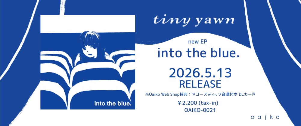 Oaiko Web Shop特典:アコースティック音源付き DLカード 拡大し続ける令和型ポストロックtiny yawn。 気鋭のレーベルOaikoとのタッグでnew EP「into the blue.」を5月13日にリリース。 3月18日リリースのSingle「nine lives」を含む全5曲を収録。 tiny yawnらしい多彩な展開と、優しくも芯のあるボーカルが随所に光る。 ワンマンライブを経て新たなフェーズへと進む、彼らのこれからに期待が膨らむ一枚となっている。 アーティスト: tiny yawn タイトル: into the blue. 価格: ¥2,200(税込) 発売日: 2026年5月13日(水) Label: Oaiko (OAIKO-0021) 【収録内容】 M1.sparkler M2.nine lives M3.DAWN M4.I try M5. sail away ------------------------------------ OVERSEAS SHIPPING IS AVAILABLE International shipments may take 2-4 weeks.