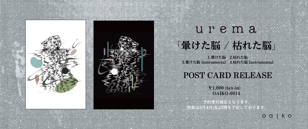 ※予約商品です。 ※到着は3月4日(水)以降となります。 ※urema tour 2026 "遠くにおいてきた光"での物販からご購入いただけます。 urema、10年ぶりの新曲「暈けた脳 / 枯れた脳」がポストカード形式でリリース。「暈けた脳」は、意識と感情の輪郭が歪み、本来は満たされているはずの瞬間でさえ、喜びとして受け取れなくなっていく感覚を切り取った楽曲であり、対となる「枯れた脳」は過去の光と、現在の自分との対話を描き出している。 アートワークは、これまでもuremaの世界観を形にしてきた山代エンナが手掛けた。本作品にはInstrumental ver.も収録。 アーティスト: urema タイトル: 暈けた脳 / 枯れた脳 価格: ¥1,000(税込) 発売日: 2025年3月4日(水) Label: Oaiko (OAIKO-0014) 【収録内容】 1.暈けた脳 2.枯れた脳 3.暈けた脳 Instrumental 4.枯れた脳 Instrumental ------------------------------------ urema releases their first new songs in a decade, “Brain Fog / Brain Atrophy,” issued in a postcard format. “Brain Fog” captures the sensation of distorted boundaries between consciousness and emotion—moments that should feel fulfilling yet can no longer be received as joy. Its counterpart, “Brain Atrophy,” portrays a dialogue between the light of the past and one’s present self. The artwork was created by Enna Yamashiro, who has long been responsible for shaping urema’s visual world. This release also includes instrumental versions of both tracks. Artist: urema Title: Brain Fog / Brain Atrophy Price: ¥1,000 (tax included) Release Date: February 1, 2025 Label: Oaiko (OAIKO-0014) Tracklist 1.Brain Fog 2.Brain Atrophy 3.Brain Fog (Instrumental) 4.Brain Atrophy (Instrumental)